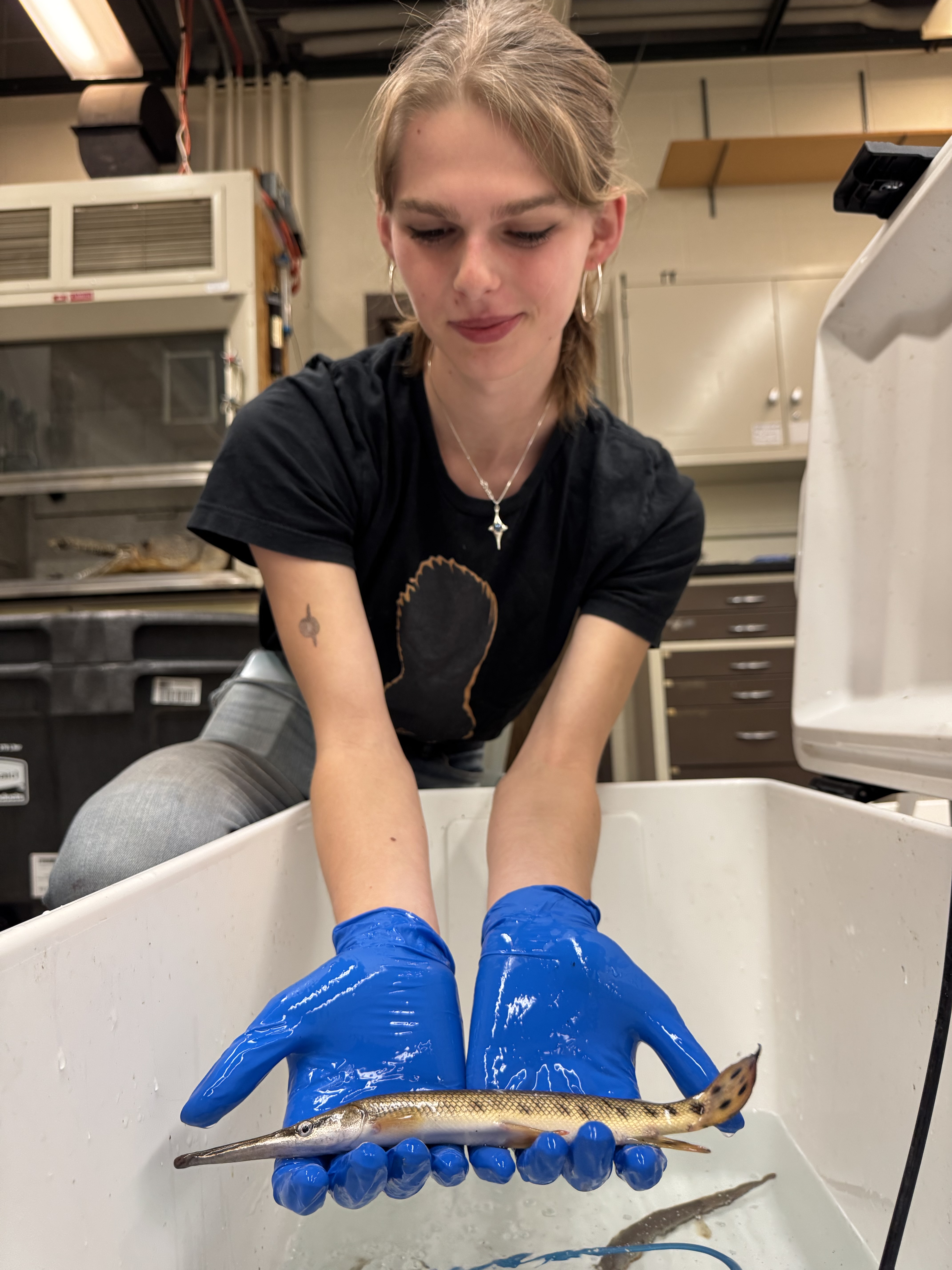Raine is a third year student studying Fisheries, Wildlife, and Conservation Biology, and she has been working in GarLab since the lab moved to Minnesota in Fall 2023. She has a diverse background in animal husbandry, with experience in many different fish stores, zoos, and aquariums, and applies this daily at GarLab.